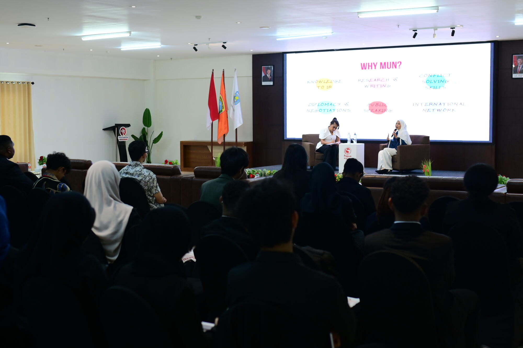 Fathia memulai cerita tentang bagaimana ia dulu juga memulai dari MUN, baik di Indonesia maupun di berbagai negara lain. Ia berbagi bagaimana simulasi sidang ini membentuk keberaniannya berbicara, memperluas jaringan internasional, dan akhirnya membuka jalan menuju pendidikan serta karier yang ia bangun hingga sekarang.
